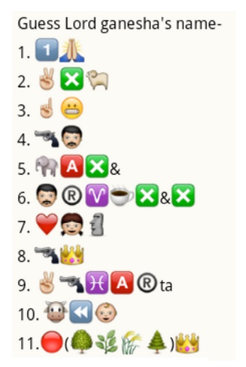 Guess Lord Ganesha’s names whatsapp puzzle Posted on March 19, 2015March 20, 2015 By Mehak No Comments on Guess Lord Ganesha’s names whatsapp puzzle Table of Contents ToggleGuess Lord Ganesha’s names whatsapp puzzleGUESS LORD GANESHA’S NAMES WHATSAPP PUZZLE Guess Lord Ganesha’s names whatsapp puzzle Guess Lord Ganesha’s names from whatsapp emoticons, smileys and symbols GUESS LORD GANESHA’S NAMES WHATSAPP PUZZLE Facebook Comments Box Whatsapp Puzzle