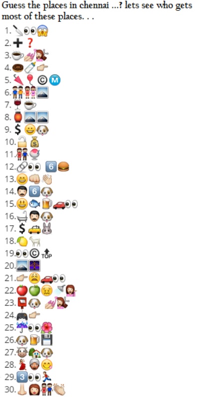 Identify the places in chennai Posted on March 18, 2015July 23, 2021 By Mehak No Comments on Identify the places in chennai Table of Contents ToggleIdentify the places in chennaiGuess the places names in chennai from WhatsApp emoticonsIdentify the places in chennai Identify the places in chennai Guess the places names in chennai from WhatsApp emoticons GIVE YOUR ANSWER IN COMMENT BOX Identify the places in chennai Facebook Comments Box Whatsapp Puzzle